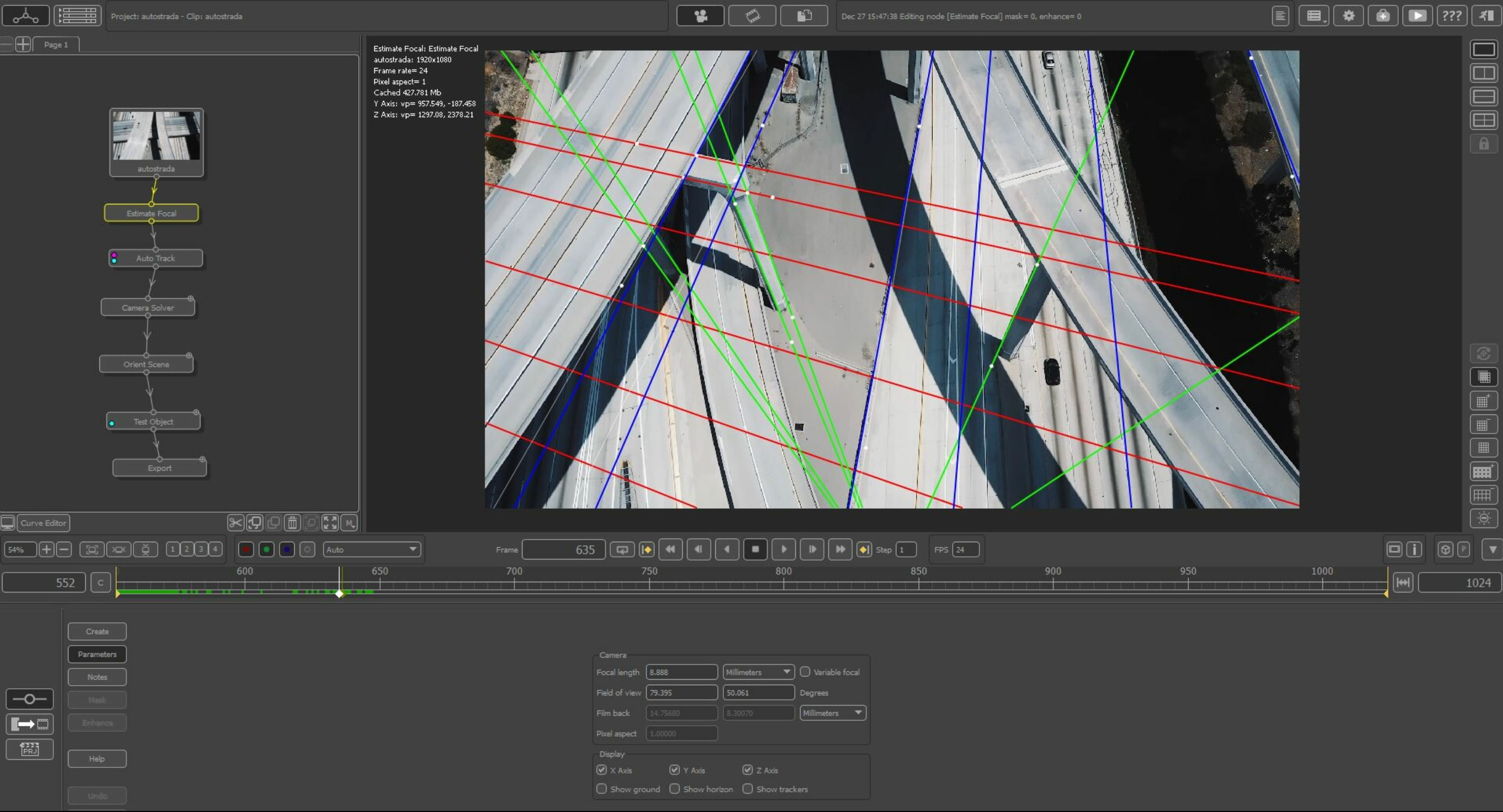 Most of the time, thanks to top-notch algorithms, PFTrack can analyze the video and estimate the proper camera focal length. Nonetheless, you can always help PFTrack refine the result by using the Estimate Focal Node, like in the following case. This is a manual operation where you have to estimate the proper perspective.