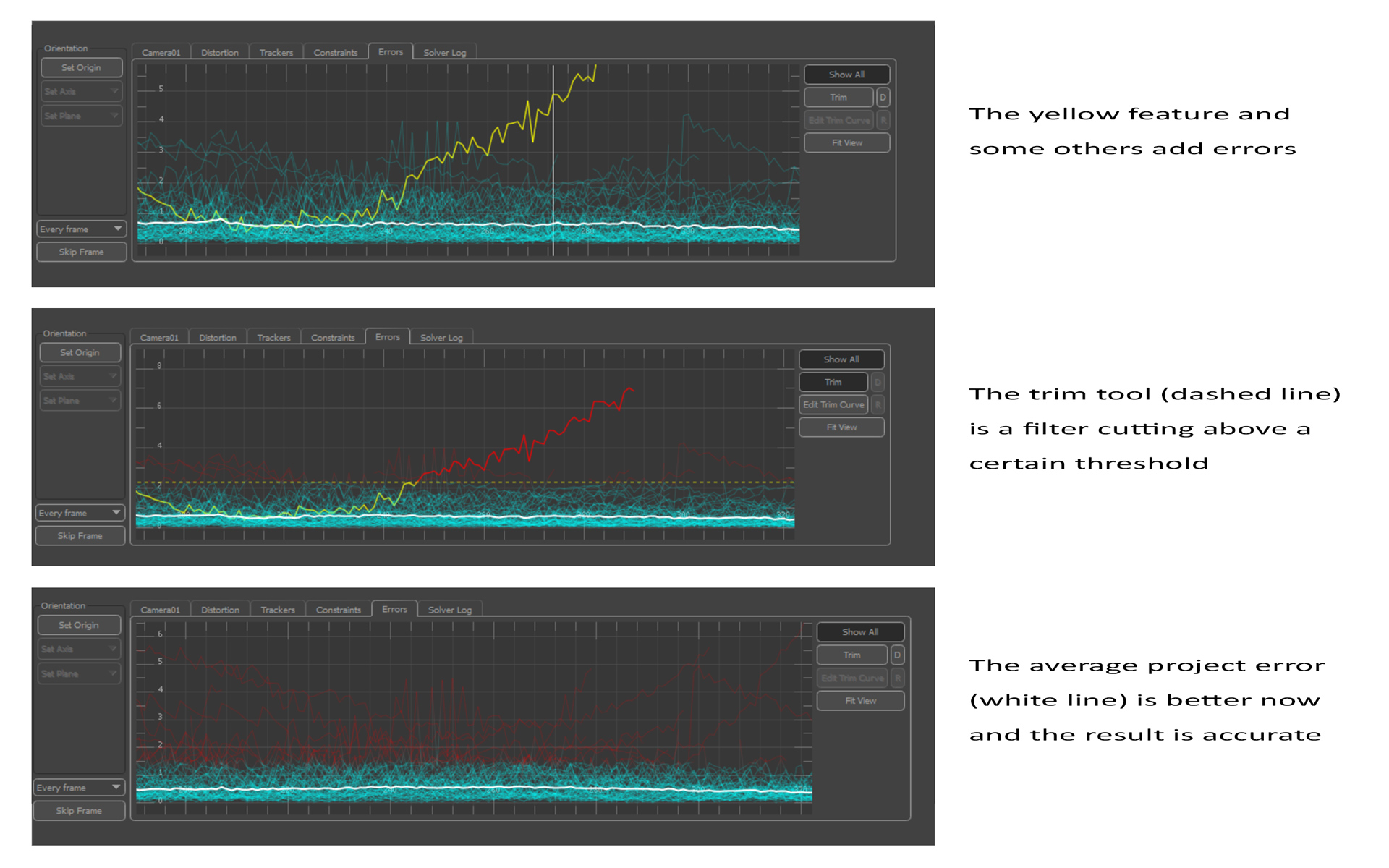 When a feature is red, it’s not solved well, and the projection error is more than two pixels. The projection error is the difference between the tracker path position and the projection of the 3D tracker point.