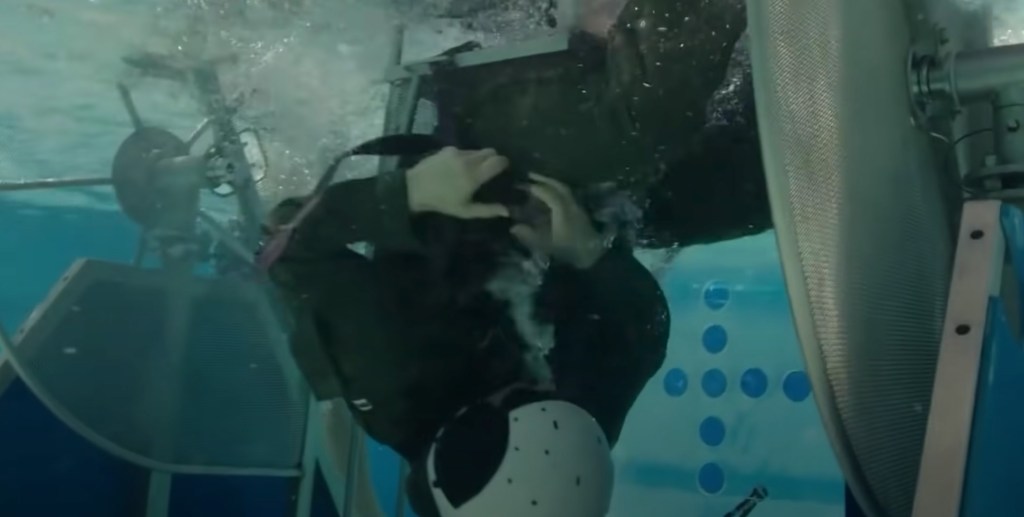Next up for the cast of Maverick was the “Naval Aviator Over Water Survival Training Course.” We all know from the first film how essential this training is (a moment of silence for Goose, please . . . ). Besides being submerged, made to swim in flight gear, and subjected to other underwater discomforts, the cast had to endure what they called “The Dunker,” which was an artificial cockpit. Attendants strap you in, blindfold you, flip you upside down, and then force you (and the giant machine holding you) underwater. The name of the game is to get out without panicking — or running out of air.