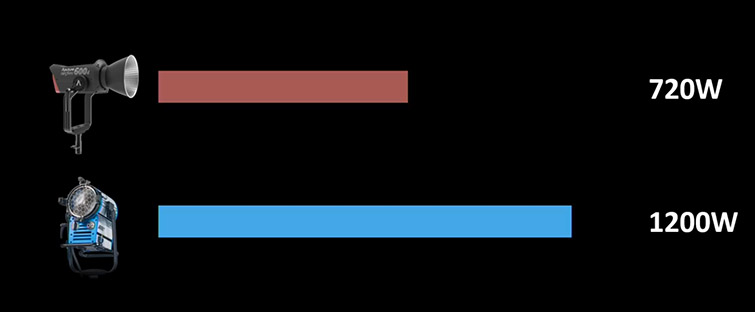 The 600d has a max power draw of 720 watts. This means that you can fit THREE of these fixtures on a standard North American circuit (20 amps). So that gives you 300,000 lux without blowing the circuit (since it only pulls 2,160 watts of power draw). Now, with an Arri M18 or 1.2K HMI on the other hand, you probably wouldn’t ever even consider using more than one on that same circuit. Too risky.