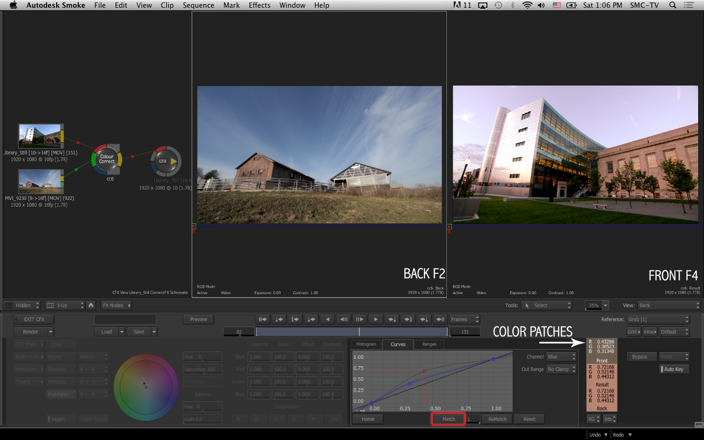 4. Press MATCH in the Curves menu controls. The Result Color Patch will change and the destination front color is now match to the back source.