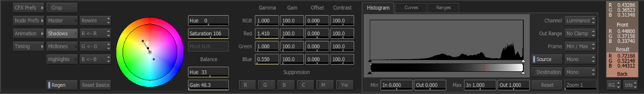 The RGB channel adjustments, again are dependent on the range selection. You have full control over the Gamma, Gain, Offset(Lift), and Contrast.