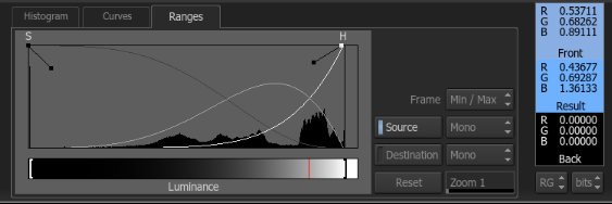 The last tab is the Range Curve adjustment menu. The Range Curves adjust the luminance levels of the Shadows (S), Midtones, Highlights(H). You can’t add points and you can only affect the Shadows & Highlights. The Midtones will react as you adjust the others. You can adjust with curves, the luminance levels within the tonal ranges. For example, adjust the Highlights color balance of your clip, now adjust the Highlights curve in Ranges. You will see how the result of your color adjustment changes.