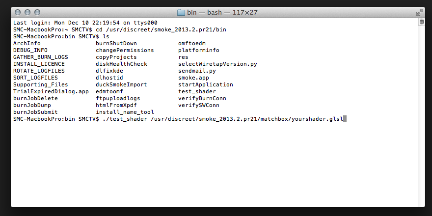 Type cd /usr/discreet/<Smoke Version>/bin [Enter] <Smoke Version> would be the folder name of your current version of Smoke. You can Shift+CMD+G in Finder and go to /usr/discreet/ to see what your current version of Smoke is. The Smoke 2013 retail release will be smoke_2013.2