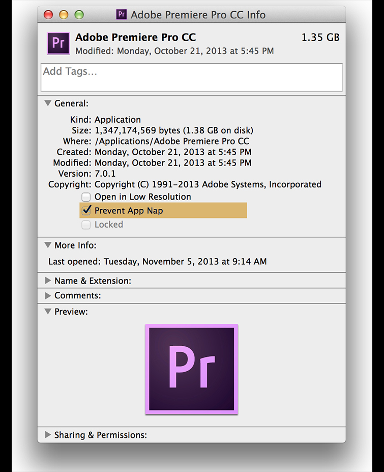 Navigate to a video editing or motion design app in your Finder’s ‘Applications’ folder. With the program name highlighted ‘Get Info’ (either by using the shortcut Command + I or by navigating to the menu bar – File > Get Info). Click the ‘Prevent App Nap’ box.