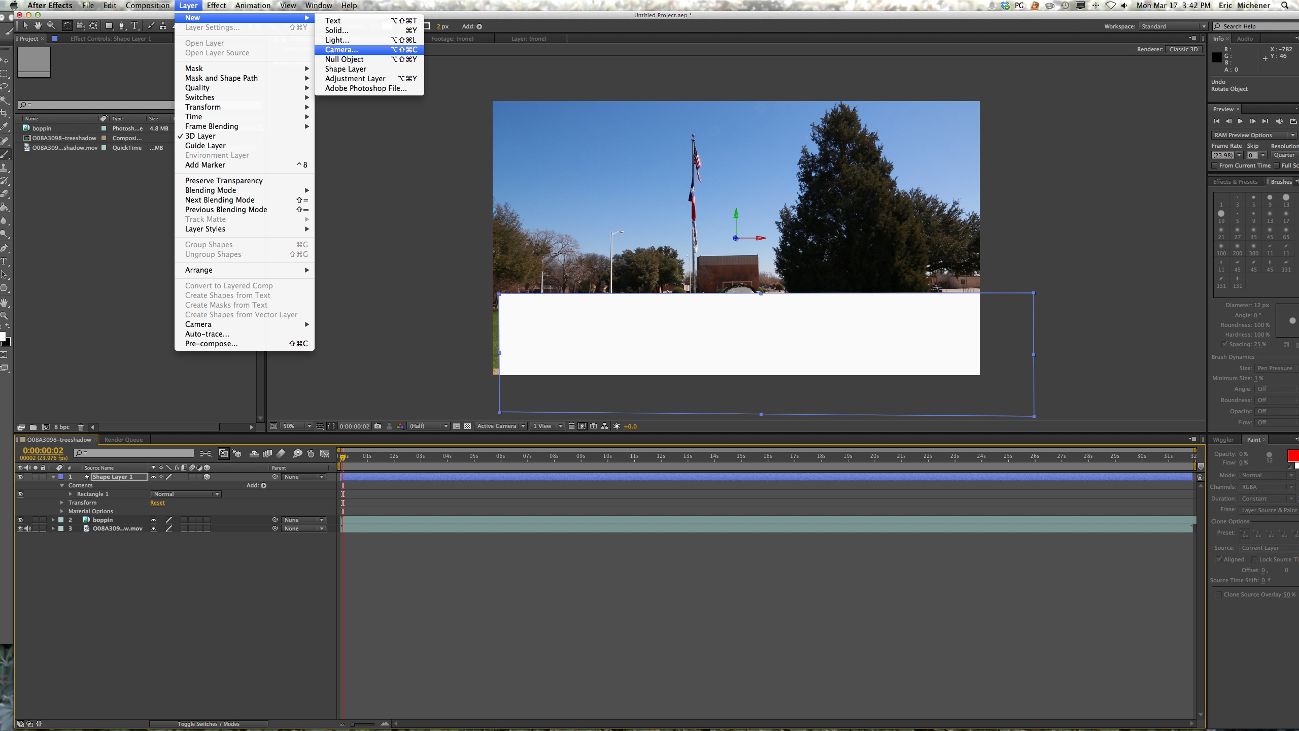 The general concept of this technique is that we are going to setup a virtual light to mimic the sun and a shape layer to accept the shadow, so you’ll first want to add a shape layer, draw a white rectangle with the shape tool and then make sure the layer is in 3D