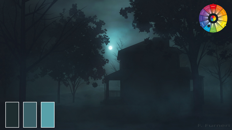 As you can notice, the shot uses little fog to remark the sense of isolation. In relation to the color scheme, we see different shades of light blue, especially in the area around the moon.