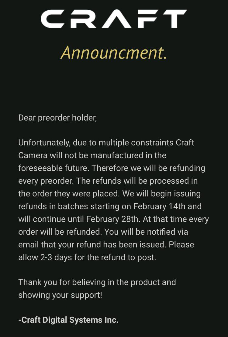 Unfortunately, due to multiple constraints Craft Camera will not be manufactured in the foreseeable future. Therefore we will be refunding every preorder. The refunds will be processed in the order they were placed. We will begin issuing refunds in batches starting on February 14th and will continue until February 28th. At that time every order will be refunded. You will be notified via email that your refund has been issued. Please allow 2-3 days for the refund to post.