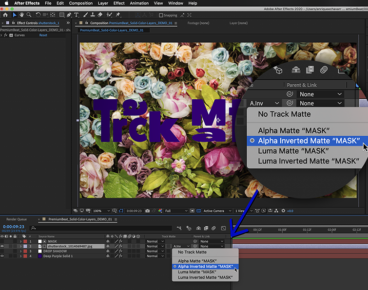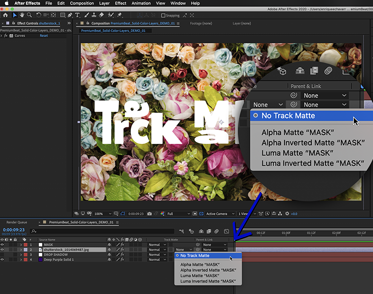 To use a Solid Layer as a Track Matte, you’ll want to toggle the Track Matte setting of the layer you wish to reveal. To do this, you must first place that layer directly below the layer serving as your Track Matte inside your timeline. Then find the column in your timeline marked TrkMat and follow it down to the drop-down for the layer you want to reveal.