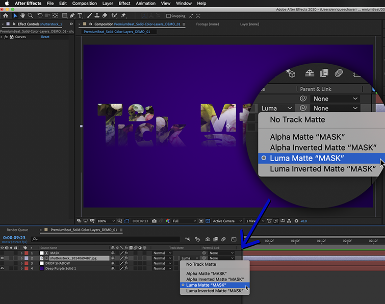 You’ll have four options to choose from — Alpha, Alpha Inverted, Luma, and Luma Inverted. Alpha will reveal your image in the shape of the matte.