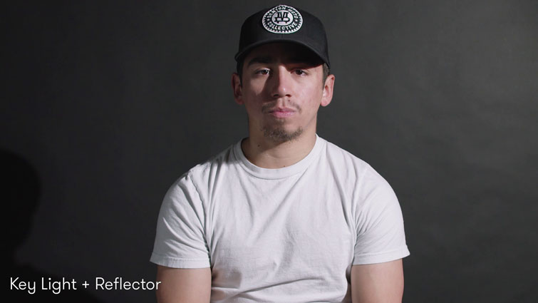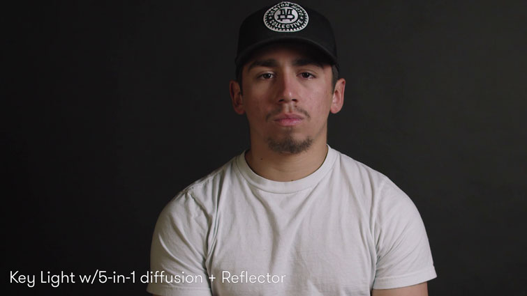 This is a great starting point, but now we’ll want to start shaping the light. One of my favorite tools is the five-in-one reflector. They’re cheap ($15-$25), versatile, and easy to take with you on every shoot. We’ll position this reflector on the opposite side of the key light and bounce the light back onto the subject. This fills in some of the harsh shadows we had and now acts as a “fill light.” Now, we effectively have a two-light setup.