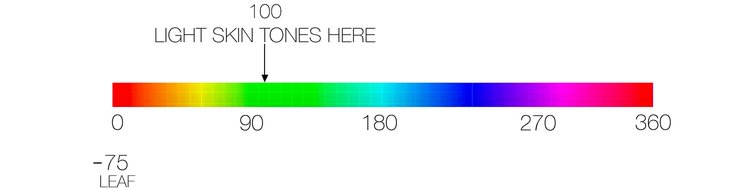 I measured the color of the leaves by placing a leaf over the color meter sensor and got a hue reading of 75 (yellow/green). If I was going to have to shift this to zero (red), I would have to shift it down by 75. So, if I wanted to arrive at a skin tone value of around 25, after the shift of -75, I set out to light my subject at a value of 100 (blue/green).