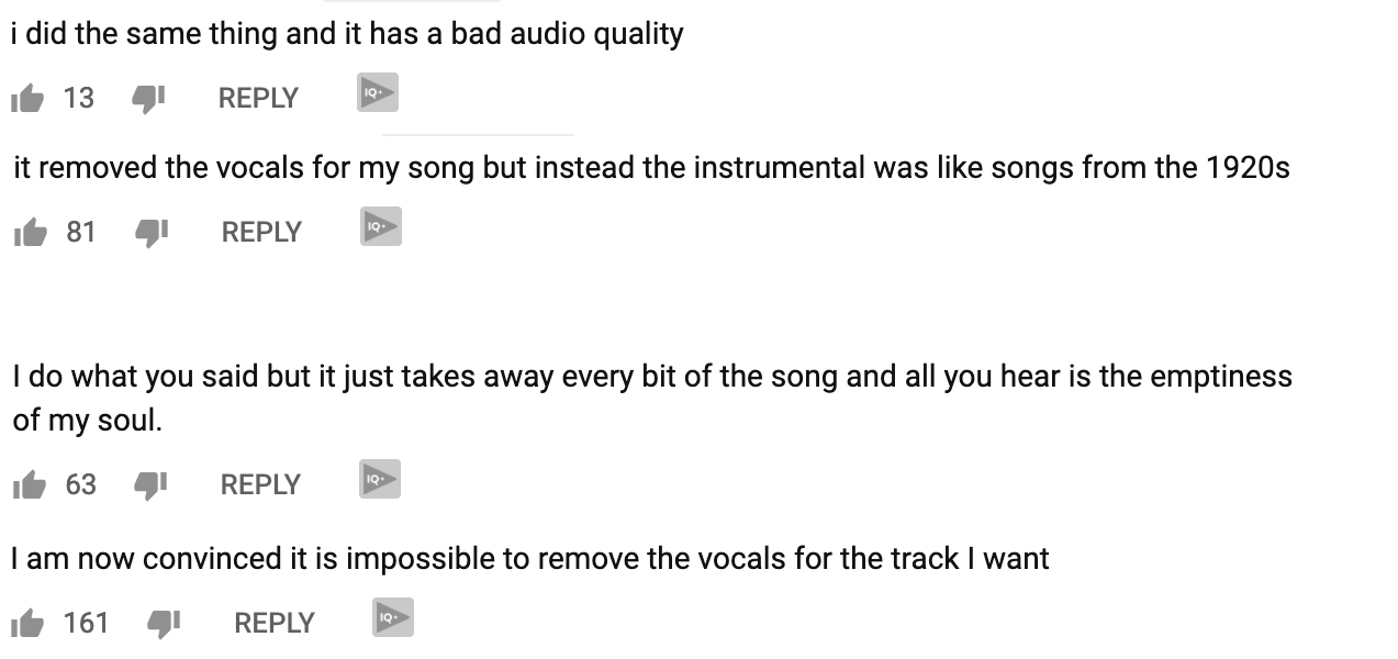 This trick may seem like the answer to all of your problems — a perfect little option in Audacity that can remove vocals with the click of a button. Sounds easy, right? Wrong! Although the video above makes it seem like it’s the easiest way to remove vocals from a track, it doesn’t always work. The program uses EQ banding to remove the high-octave levels in the song — where the vocal track usually lies. But the problem is that many songs have instrumental tracks in the same octave range as the vocals. This creates a problem for the vocal reduction program, and it tends to alter the entire song in the process. Just take a look at the YouTube comments on this video: