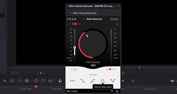 The ERA 4 Noise Remover will appear as a one-knob pop-up UI when you add it to an audio clip. It’s simplistic and automated. As stated by Accusonus,