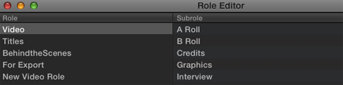 Create a new type of role by using the + button. You’ll probably want to create several audio specific roles (Music, Sound Effects, etc.) and several video specific roles. You can create sub-rolls for each type of roll as well (for instance, under Video possible sub-roles could include Interviews, B-Roll and Graphics).