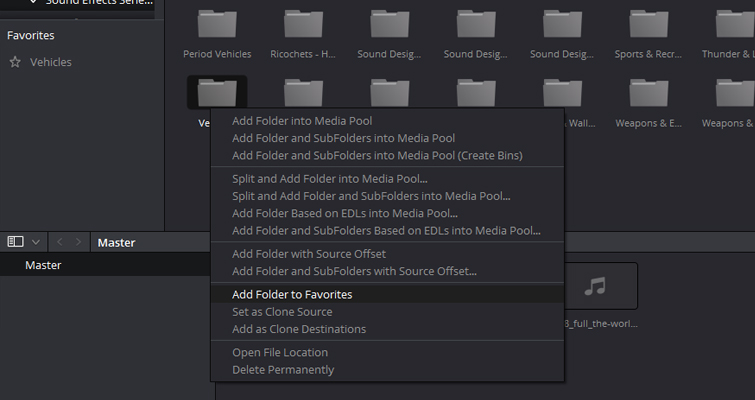 Do you have a set of elements or sound effects that you use often, but there are just so many that importing the entire folder would be too process heavy? If so, look at setting up a favorites folder. Very simply, while on the media page, navigate to the designated folder in the volume list, right-click, and select Add Folder to Favorites.