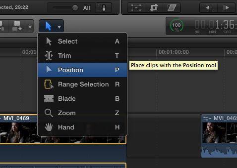 Today, I don’t feel quite the same — and a synchronized dance it certainly is not (or not yet at least). Back in April when I imagined the great things that this feature had in store I didn’t think much about the possibility that it could also create problems. For one, I don’t always put clips back to back — in fact, as I stack video layer upon video layer I often intentionally leave pockets of black in between clips. During the first few days of trialing Final Cut Pro X the magnetic timeline drove me nuts. THEN I found the Position tool…