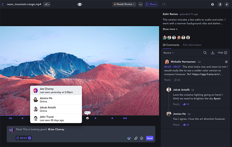 Commenting and collaborating on a video will be even easier with the new commenting abilities. It’s like if Slack had a video commenting function — the new Frame.io includes @ commenting, detailed time-stamping, and range timestamps to comment on a selection of video.