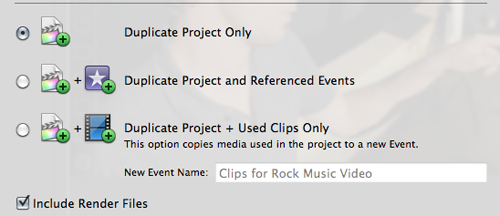 This option will only copy the timeline/project but not the media that appears within the project. If you plan on keeping the media online and simply want to save the project file, this would be your pick — however if you move or delete the media without saving, you’ll have a project without files (potentially disastrous). FCPX project files take up so little hard drive space, so don’t duplicate them thinking it’ll have a significant impact on your drive space.