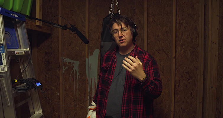 One of the rules in our competition was to not leave the studio to record anything. But, a professor taught me long ago that one of the first rules of filmmaking is that there are no rules (Sorry, Chuck, I wanted to win). So to record my punching foley, I went to an actual punching bag in my brother’s backyard shed. To me, there’s nothing that truly replicates the bassy hits and taught chain sounds of a real boxing bag. Just record it as clearly as possible, and then once you bring it into post, you can add or remove reverb to make it fit the environment in your clip.