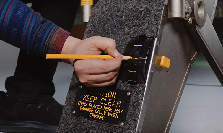 After extended use, the Fisher dolly may need a recharge. You can tell by the psi gauge located near the back of the dolly. You can run a normal stinger to the charging port and then flip the switch to “on,” which will then charge the dolly. (It will turn itself off once it has reached a maximum charge.) Or, if you find yourself without accessible power, you can use one of the handles as a crank and manually restore power.