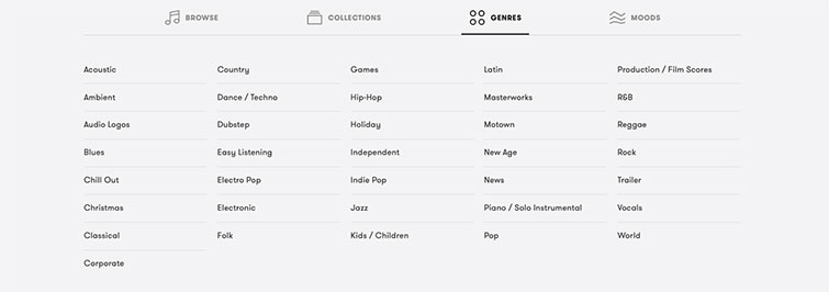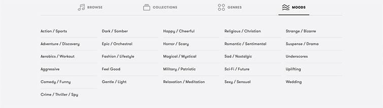 On PremiumBeat’s home page, hover over to Genres, where you’ll find all manner of different genres, such as chill out, easy listening, and games. Each genre presents a wide selection of curated songs for your listening, but if you prefer to choose by mood, PremiumBeat has that too.