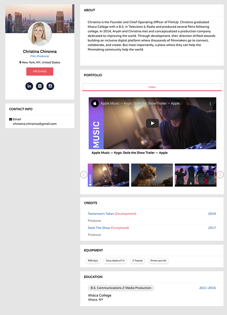 Every filmmaker has a profile and each profile has a portfolio section where you can add videos, photos, music, and writing samples. It also includes sections where you can input your bio, credits, equipment you own, contact info, your social media links, etc. And with the community search tools and direct messaging features you’re able to contact anyone on our platform.