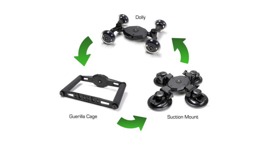 The heart of the Tooga System is the “Shell” a camera plate that is used for each of the extensions (dolly, guerrilla cage, suction mount). To use any of these extensions you simply pop the Shell onto the components (wheels, suction, etc). The component system is designed to work with DSLR cameras, smartphones and GoPro cameras. Check out this video for a quick run down on how the Tooga System works: