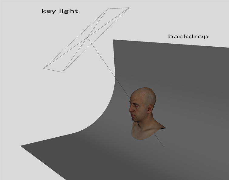 The most difficult part of the badger lighting setup is to find a proper position and orientation for the two area lights at the back of the subject. They have to produce the following shadow pattern.