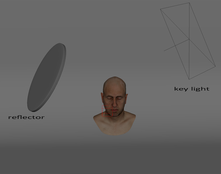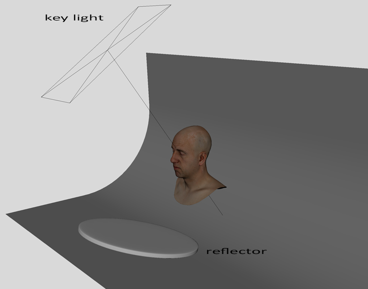 - A Fill Light or, in this case, a reflector, which takes the incoming light (from the key light) and makes it reflect the character