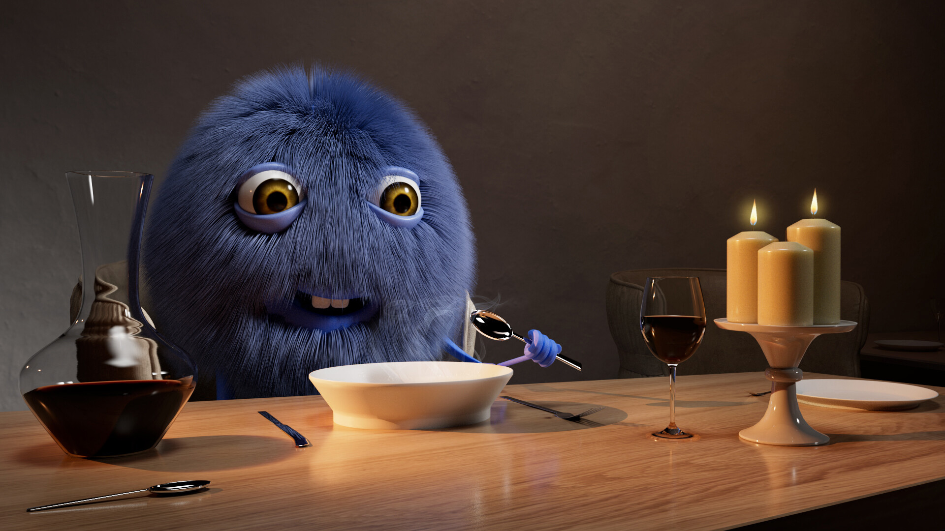 - Background Light: A very soft light illuminating the wall behind. Remember not to increase its intensity a lot since the main focus is on the table.