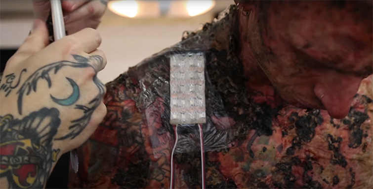 In a five-hour process that, uh, Machine Gun — or maybe it’s just Kelly? Anyway, Machine Gun Kelly had to spend five hours a day with the VFX team as they embedded LED light panels, wiring, and power sources within the actor’s prosthetic suit.