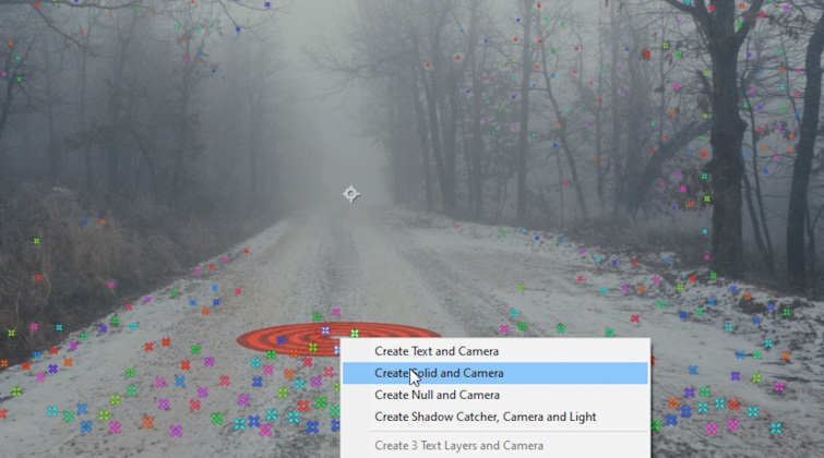 This effectively sets that 3D area as the center of the composition, making it easier to navigate when new files are added. Finally, right-click on the same area of tracker points and select Create Solid and Camera.