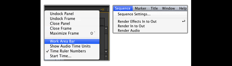 The work area defines what clips and effects are rendered. I prefer to use “in and out” instead, as this is a standard editing convention. This setting is in the Sequence Menu pulldown. When you change this, it also changes the Sequence Menu settings to “in & out” instead of work area.