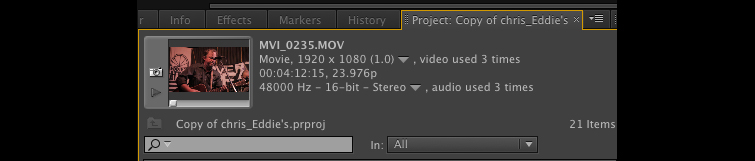 There’s a quick way to find out where and how many times a video clip has been used in a Premiere Pro sequence. If you select a clip in the project window, at the top of window to the right of the thumbnail viewer, you will see details about the clip, including how many times it has been used in a sequence. If you click on the “clip usage” pulldown, select the instance of the clip you want to see and it will open that sequence if it is in multiple sequences. This is a handy way to find clips.