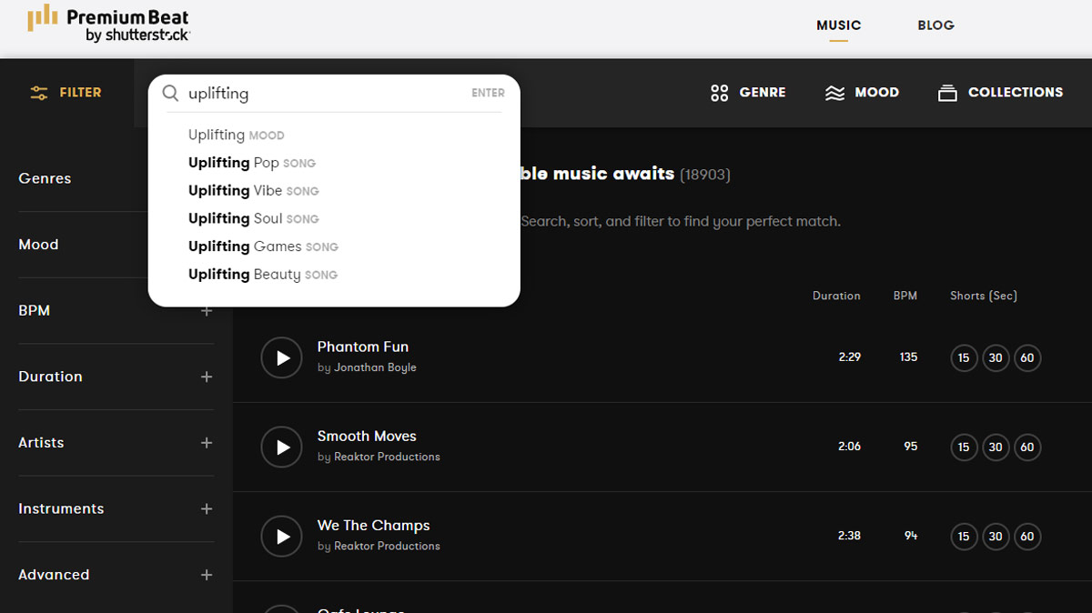 Between PremiumBeat’s 20,000+ songs and Soundstripe’s 4,000, well, that’s a lot of music. With so many songs to choose from, search power matters.