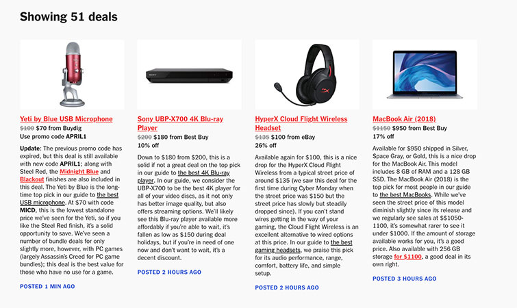 Why it’s useful: Helpful context written by humans accompanies each tip, helping searchers make informed decisions and navigate previous Wirecutter posts about products they never knew they wanted. A quest for constantly low prices defines the site. Wirecutter is easy to use, and it also offers deals on goods other than electronics, helping users save across the board.