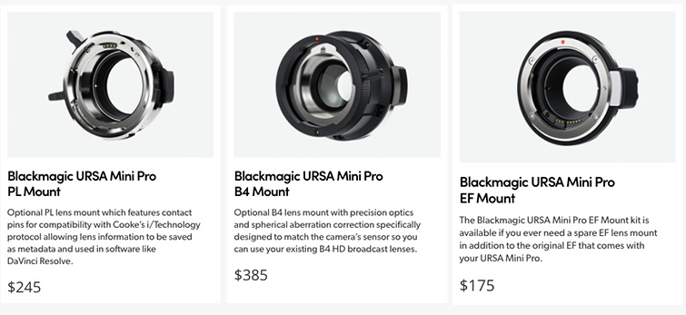 Yet another great addition for the URSA Mini Pro is swappable mounts. This way, you don’t have to be married to one mount or another. Also, the swappable mount options are extremely affordable, considering what other companies offering swappable mounts charge (looking at you, RED). They have a mount option for every type of shooter: Cinema (PL mount), Broadcast (B4 Mount), and EF Mount for your standard canon-mount option for general shooting and lower cost lenses.