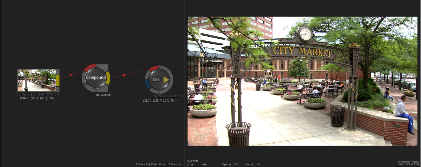 The Compound node will compress multiple frames into a set range. It acts like the Average node, but since the image gets compounded, it should remain sharper than an Average blend. The resulting clip will be shorter. The Compound node can help in creating clean background plates for compositing. The node works best on lock down or stabilized shots.