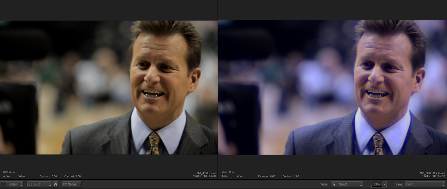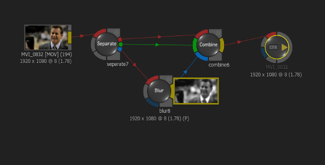 The Combine node will combine those clips back together into a single RGB clip. Separating the clips gives you the flexibility to effect a clips channel away from the others. For example, you could Blur just the Red or Blue channel to create an interesting grade and style to your footage.