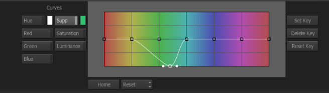 Smoke’s Color Curves node is normally used in relation to Keyer nodes to remove color spill. With Color Curves you can isolate colors for suppression or hue shifting. When you select a color, you will see it plotted in the color graph. Points can be added to the graph. By pulling the points down colors will be suppressed and raising them will cause the colors to be increased.