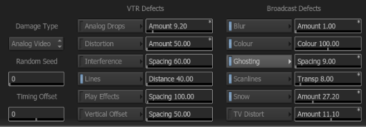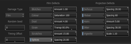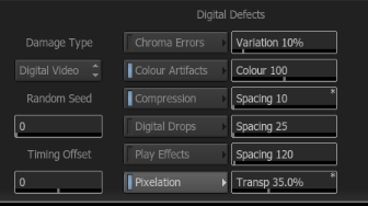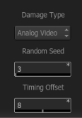 There are 2 global settings that affect the Film, Analogue, and Digital damage looks. Under the effect chooser, is a numeric slider for Random Seed and Timing Offset. The Random Seed value will, as the name implies, create random variations in the effects. If you don’t like the way the film scratches are scratching, then adjust the random seed value.