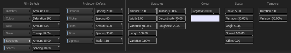 The Film Effect divides the look settings into 2 areas, Film Defects and Projection Defects.