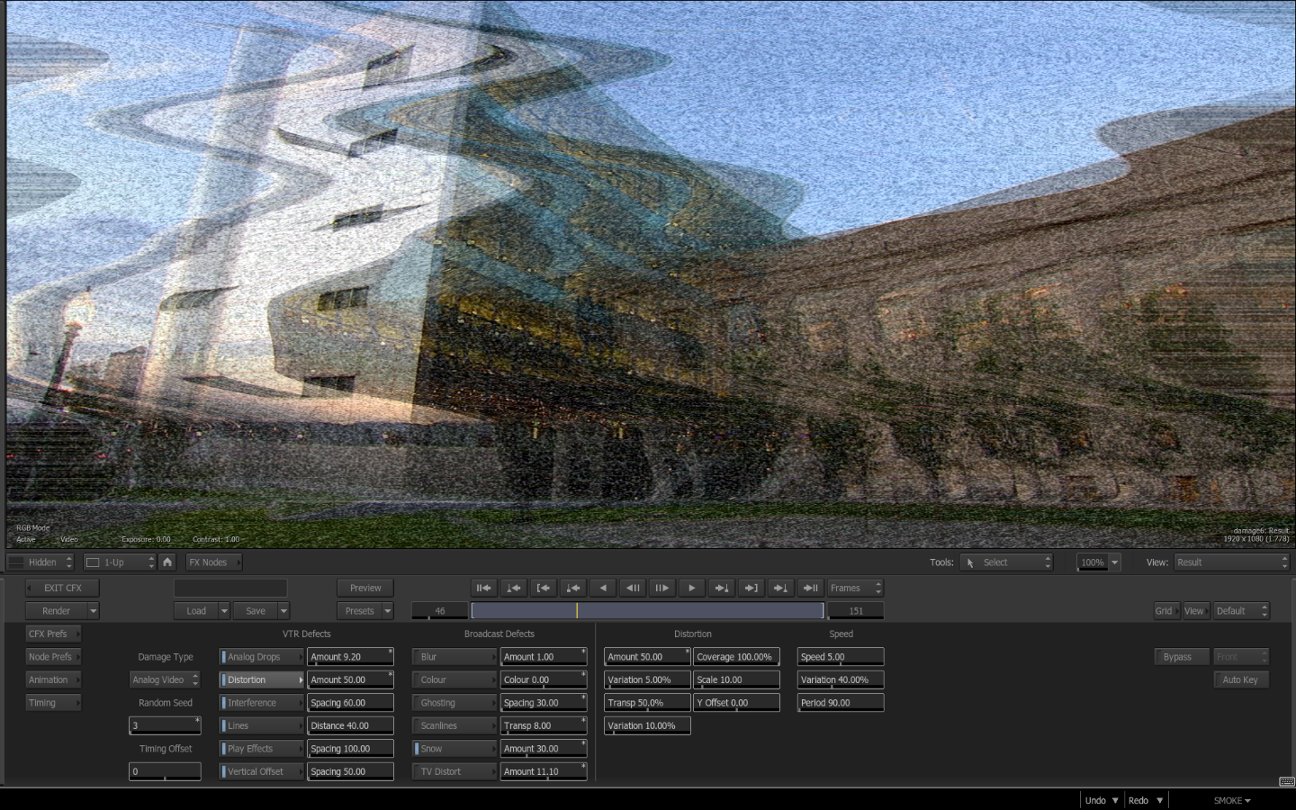 By keyframing the amount of ghosting or TV Distort you can ramp up and ramp down the effect to create a Bad TV or Videotape distortion transition if you use the Damage node as a GAP CFX clip on the timeline as an adjustment layer.