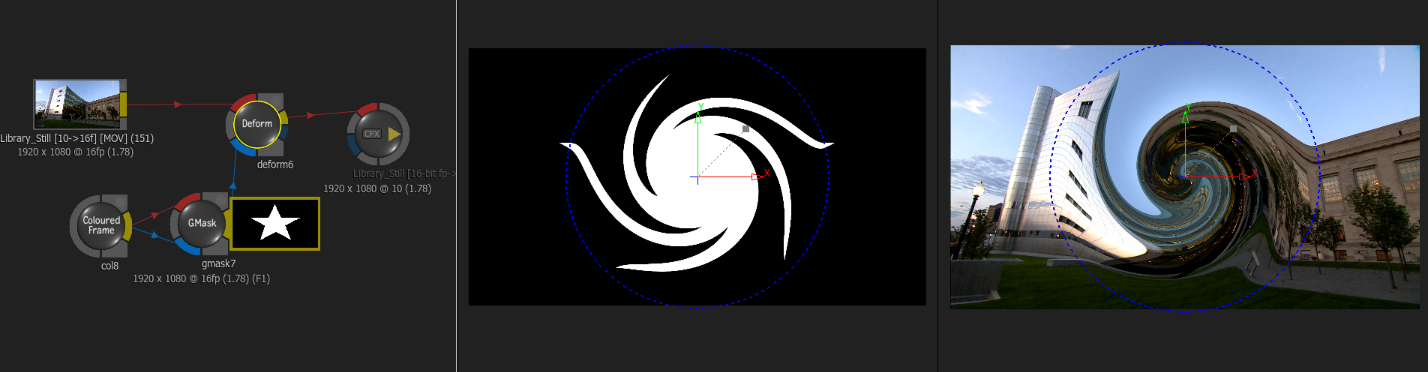 One thing to note about the Matte input: in other nodes like the Color Warper or Blur, the Matte input would act as a mask. This would restrict the effect to the mask shape. Deform’s Matte input doesn’t do that. The effect is applied to the entire image, but the matte is affected by the deform as well and then passed on to the output. So you can feed a Front and a Matte Source and deform both channels simultaneously.