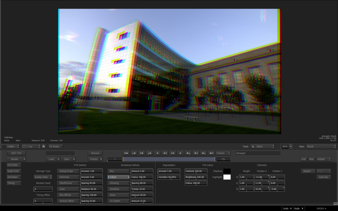 Under the Broadcast Color settings, you can adjust the weight and X-Y positions of the individual RGB channels. This is similar to the same type of color separation that was found in the Blur Node.