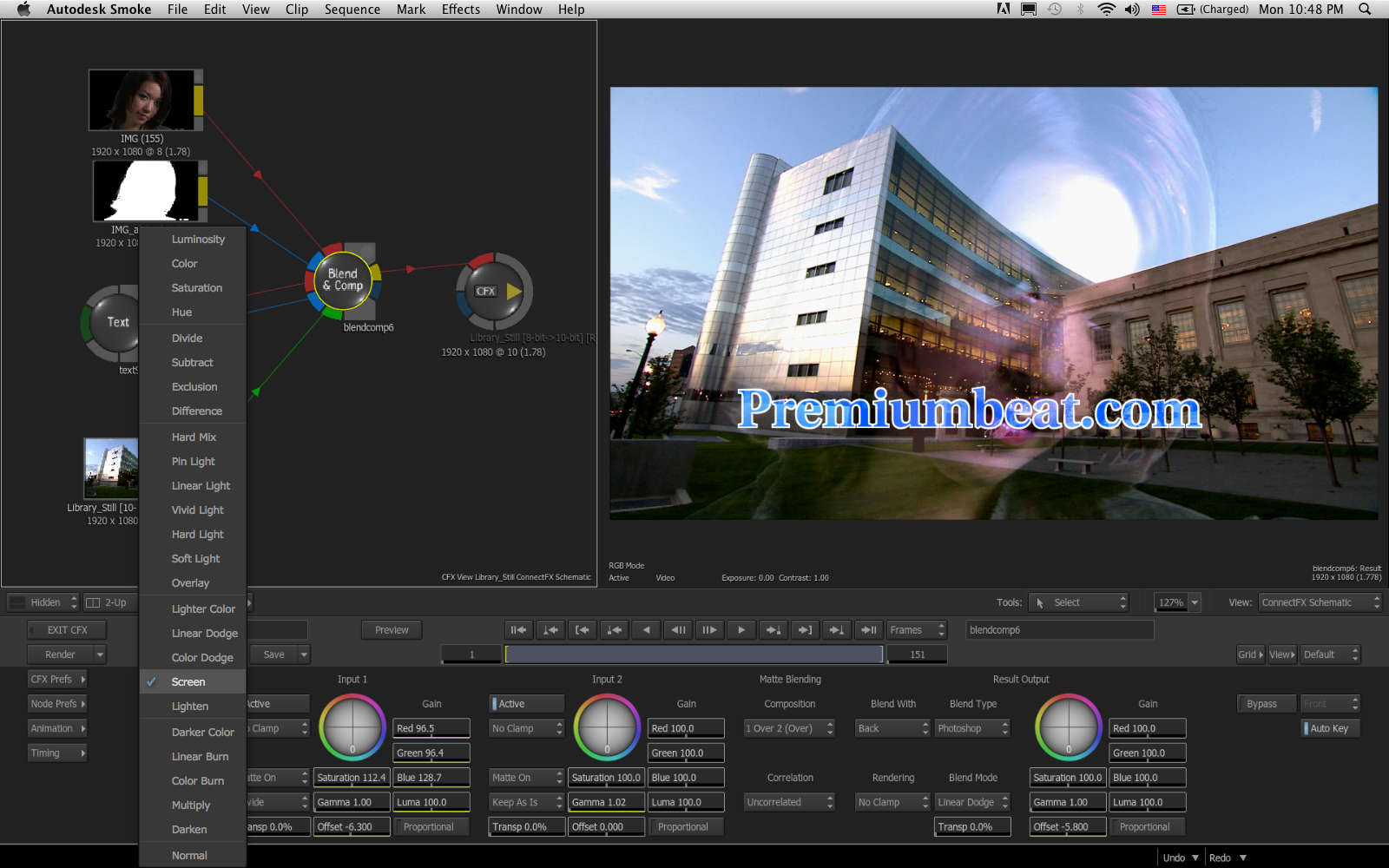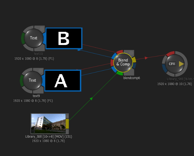 This flexibility, can create some very interesting looks and effects to the final result. If you are familiar with how blend modes work with layer in Photoshop or After Effects all of those same looks can be achieved inside Blend & Comp. You then have additional color and level controls that affect the final composite, not just the background clip. The result of the 2 inputs and background can seen on the output of the node as well as the result of the matte blend if needed.