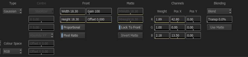 The Blur node is pretty self-explanatory, but as with most of the tools inside Smoke it has lots of options and customizations. The Blur node accepts both a Front and Matte input and will output the same. However, you have the option of having different blur values for the front and matte on output. If you are working in 16bit float, you have a clamping option for the input color and luminance levels.