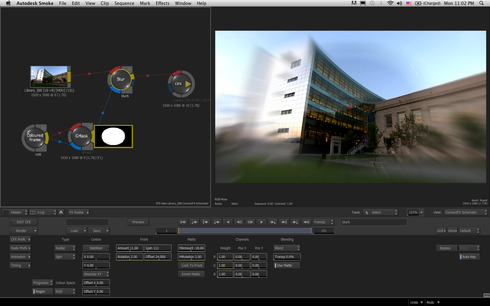 As you can see the tools in Smoke are very deep and there are a lot of options and setting to create and customize the look you want. What sounds like a basic node, like Smoke’s Blur and Blend & Comp, is a very complex tool, but once you get comfortable with the nodes you can easily and quickly get the results you want.