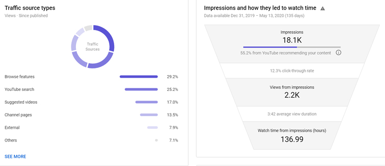 As you can see above, 55.2% of my 18.1K impressions are coming from YouTube’s recommendations to site users. This is exactly what I was hoping for when I uploaded the videos.